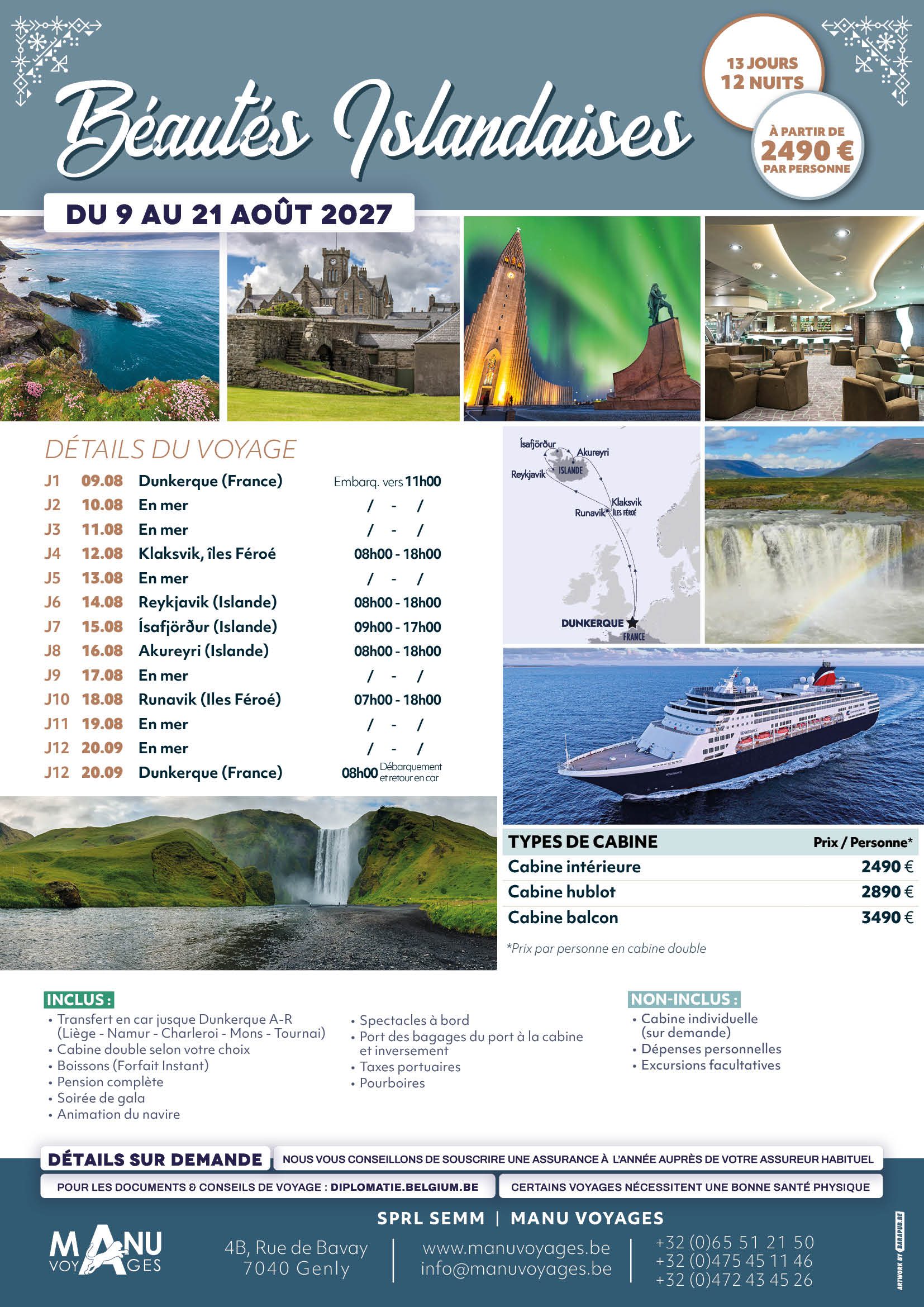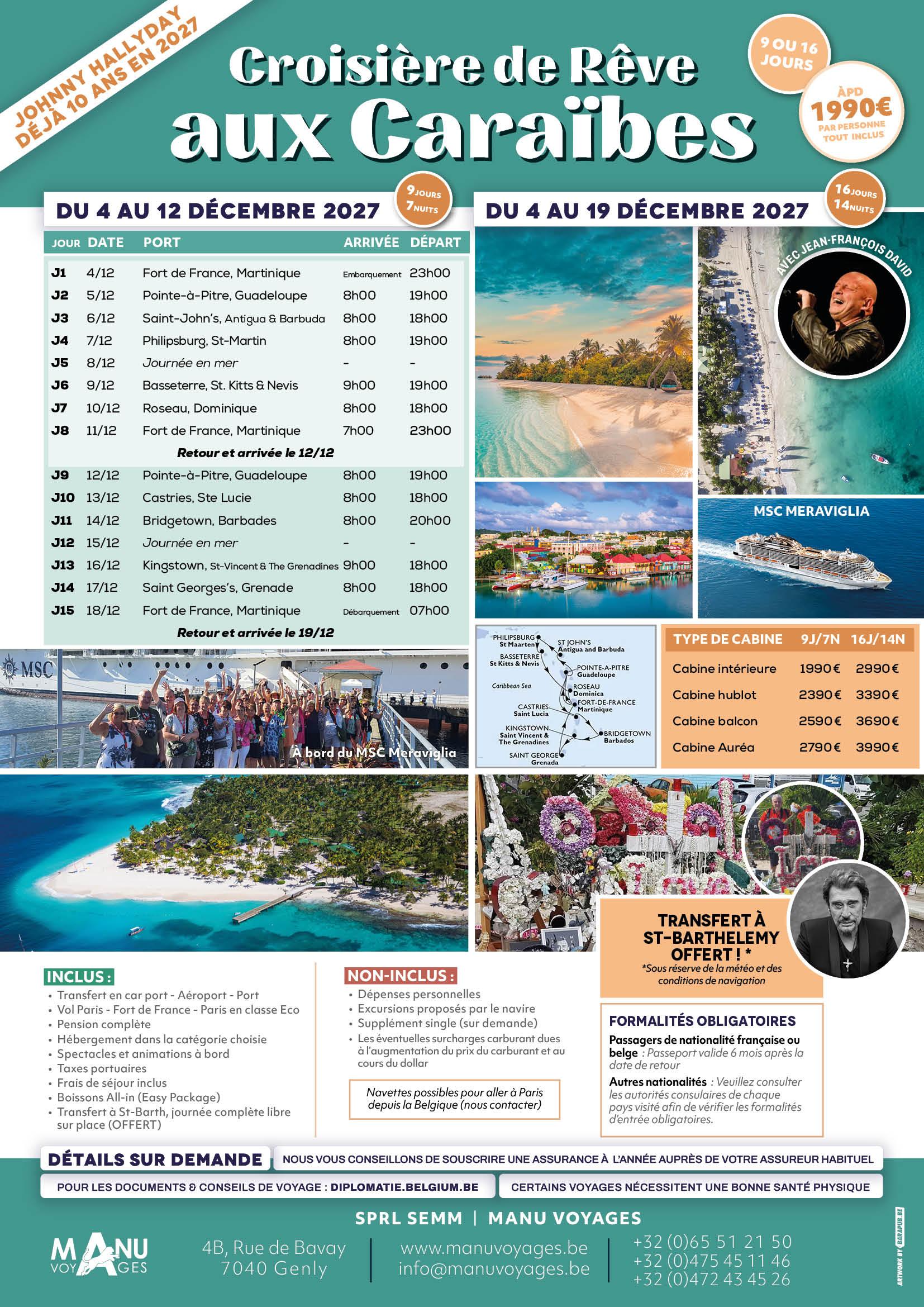 Prix TTC à partir de 1990€ EN 9J ET 2990€ EN 16J DU 4 AU 12 DECEMBRE 2027 OU DU 04 AU 19 DECEMBRE 2027 9J/7N OU 16J/14N Télécharger le document Inscription Description SUR LE MSC MERAVIGLIA – RENDEZ VOUS A L AEROPORT – NAVETTES POSSIBLES DE BELGIQUE POUR L AEROPORT SUR DEMANDE Inclus VOIR […]